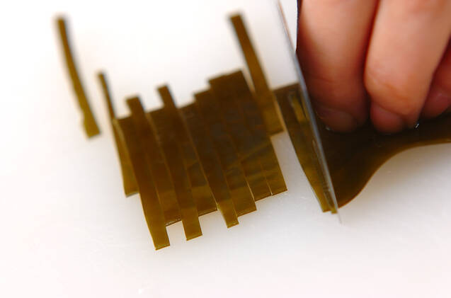 昆布は水でもどしてマッチ棒位に切る。干しシイタケは水又はぬるま湯でもどして薄切りにし、生シイタケも薄切りにする。