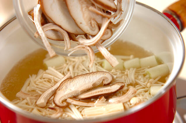 鍋にだし汁、白ネギを入れて中火にかけ、煮立ったらエノキと生シイタケを加えてしんなりするまで煮る。