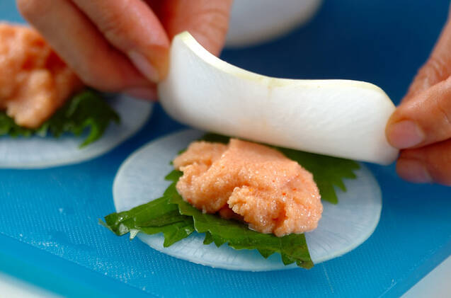 大根の水分を拭き取り、大葉と明太子をはさんで器に盛る。