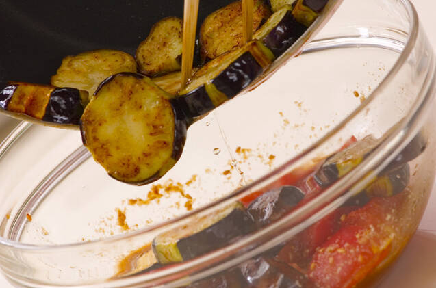 フライパンにサラダ油を強火で熱し、ナスを炒めて2の<ドレッシング>に混ぜ合わせ、3のペンネに<ドレッシング>ごと掛ける。お好みで塩コショウを掛けて下さい。