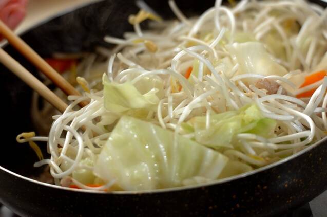 深めのフライパンに分量外のサラダ油をひき、豚肉を炒める。表面に軽く火が通ったら、ニンジン、キャベツ、サッと水洗いしたモヤシを炒める。