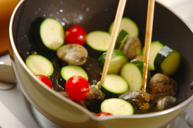 フライパンにオリーブ油、ニンニク、アンチョビを加えて弱火で加熱し、香りがすればアサリとズッキーニ、プチトマトを加えてサッと炒める。