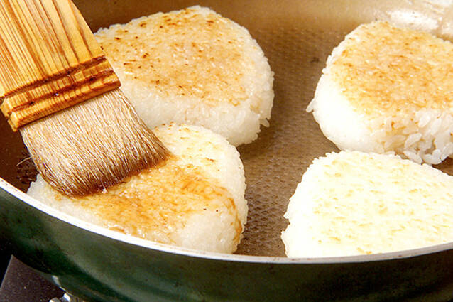 フライパンにサラダ油を敷いておにぎりをのせ、両面おいしそうな焼き色をつける。両面に味しょうゆをぬり、香ばしく焼く