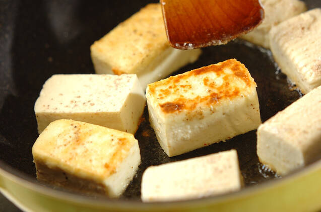 フライパンにサラダ油を熱し、絹ごし豆腐を両面こんがり焼き、器に盛る。