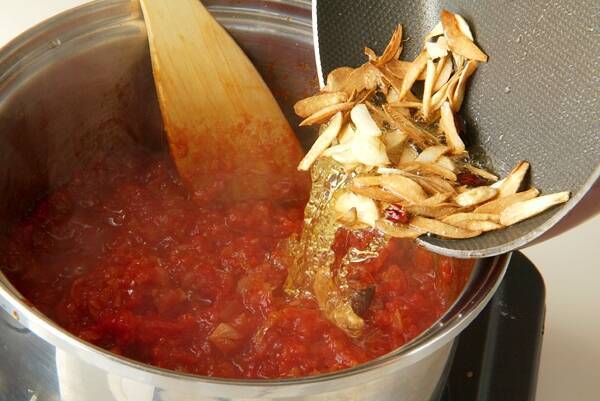 鍋にオリーブ油、ニンニク、赤唐辛子を入れて火にかける。弱火でニンニクがキツネ色になるまで炒める。
