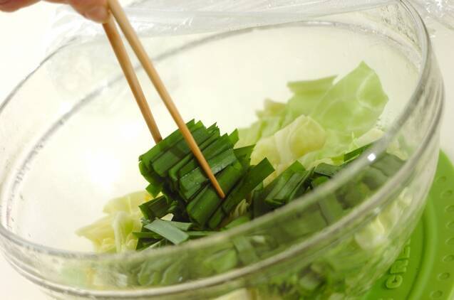 耐熱容器にキャベツを入れてラップをかけ、電子レンジで2分加熱する。上にニラを散らし、再びラップをかけ、1分加熱する。