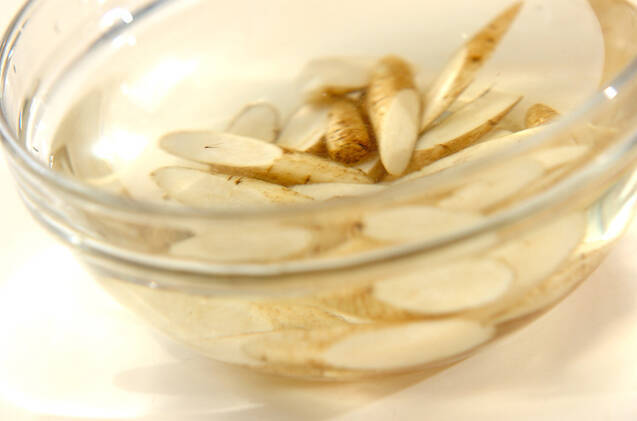 ゴボウはたわしできれいに水洗いし、幅1cmの斜め切りにして水に放ち、アクを抜く。