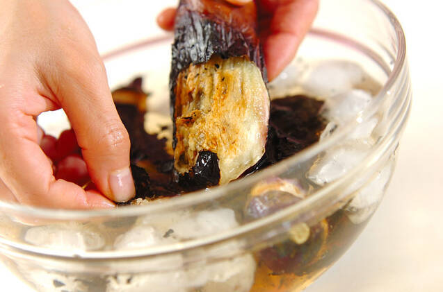 焼き網を強火で熱してナスを並べ、皮が真っ黒に焦げるまで焼く。氷水に取って焦げた黒い皮をむき、しっかり水気をきり、冷蔵庫で冷たく冷やしておく。