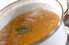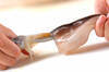 イカは胴と足がくっついている所を指で引っ張ってはずし、足を持って胴から引き抜く。胴は水洗いして軟骨を抜き取り、幅1.5cmの輪切りにする。足は目の際で切り落としてくちばしを取り、足先を切り揃える。吸盤は包丁でこそげ落とし、2本ずつに切り分ける。