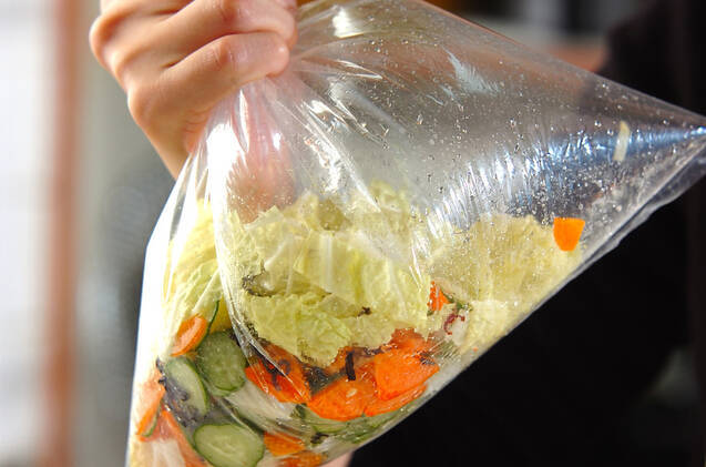 <柑橘しょうゆ>以外の全ての材料を抗菌のビニール袋に入れ、ビニール袋に空気を入れて口をねじって持ち、振りながら全体に塩をからめる。袋の空気を抜き、口をしばって水気が出るまで置く。