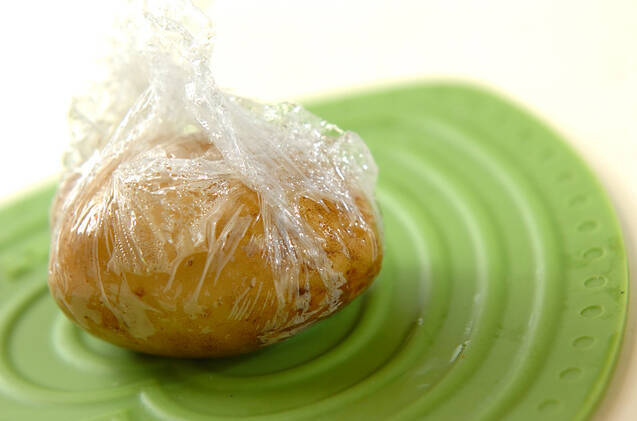 新ジャガイモは皮ごときれいに水洗いし、濡れたままラップで包んで電子レンジで1~2分加熱し、竹串がスーっと刺さればOK。そのまま置いて粗熱が取れたらひとくち大に切る。