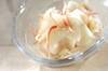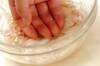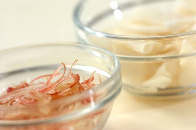 カブは皮をむいて縦半分に切り、切り口を下にし、端から薄切りにする。塩少々を振ってもみ、しんなりとしたら水で塩を洗い流し、絞る。