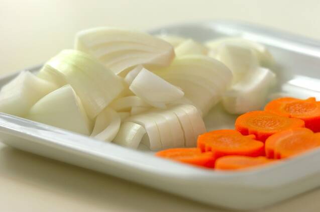 玉ネギは横半分に切り、さらに4~6つのくし切りにする。ニンジンは皮をむいて厚さ1cmに切り、型抜きをしてサッと水を通し、耐熱容器に入れてラップをかけ、電子レンジで1~2分加熱して冷ましておく。
