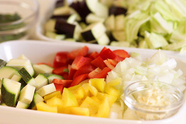 <野菜のトマト煮の作り方>玉ネギ、ズッキーニ、パプリカ、キャベツ、ナスはヘタや種を取り、それぞれ1.5cm角に切る。ニンニクはみじん切りにし、バジルはちぎっておく。