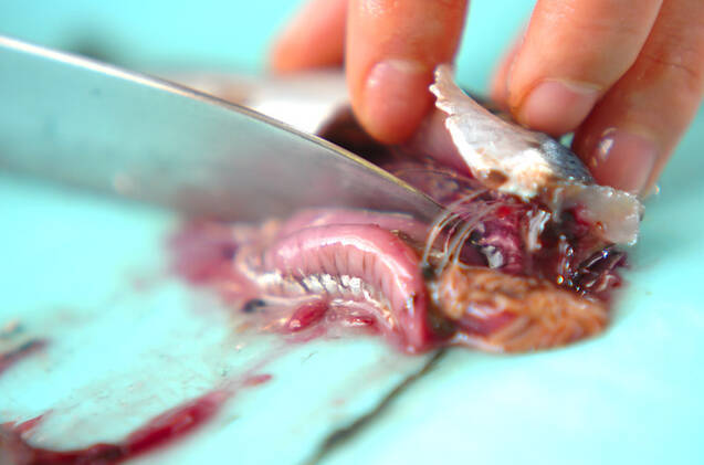 イワシはヌメリを取り、頭を切り落としてワタを出し、水洗いして水気を拭き取る。