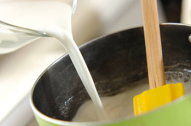 砂糖が煮溶けたら、沸騰状態で2分煮、牛乳を少しずつ加える。混ざったら鍋底を冷水に当てて粗熱を取る。