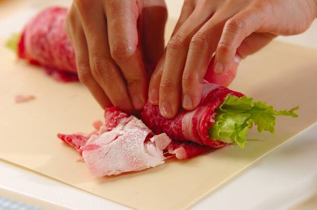 レタスを1/4~1/3量ずつ牛肉にのせて巻き、全体に薄く小麦粉を振る。