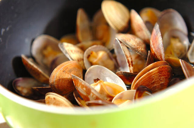 アサリは分量外の塩水で殻と殻を軽くこすりあわせて洗い、水気をきって鍋に入れ、酒を加え蓋をして強火にかける。アサリの口が開いたら火を止め、アサリを取り出して身を殻から外す。蒸し汁は、水を軽く絞ったキッチンペーパーでこす。
