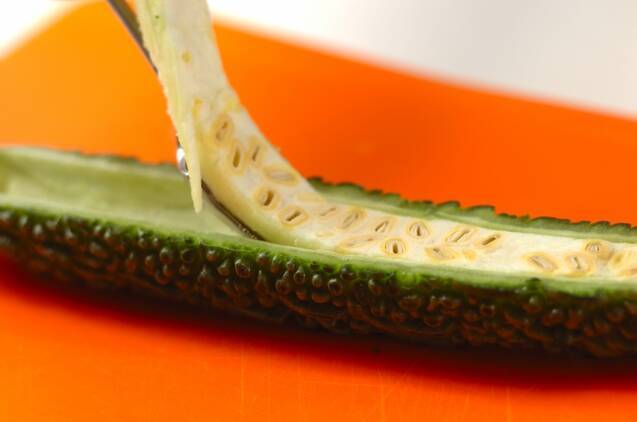 ゴーヤはスプーンで種とワタを取り除く。幅2~3mmの薄切りにし、塩でもんで5分程置き、出てきた水分を絞る。熱湯で1分程ゆで、水にさらしてザルに上げる。かたく絞ってしっかり水気をきる。