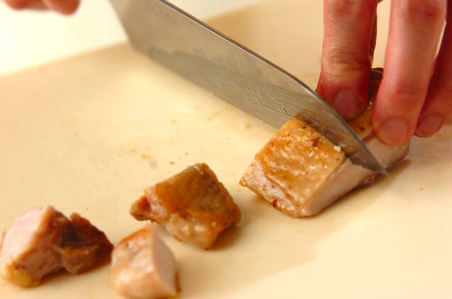 鶏もも肉に塩コショウをし、オリーブ油を熱したフライパンで両面焼き色がつくまで焼き、粗熱が取れたら1.5cm角に切る。
