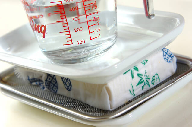 <ひりょうず>を作る。<ひりょうず/生地>の木綿豆腐は布巾で包んで重しをし、水気をしっかりきる。(ヒント)何枚か重ねたキッチンペーパーを耐熱皿に置いて木綿豆腐をのせ、ラップをかけずに600Wの電子レンジで2分くらい加熱して水きりしてもOKです。