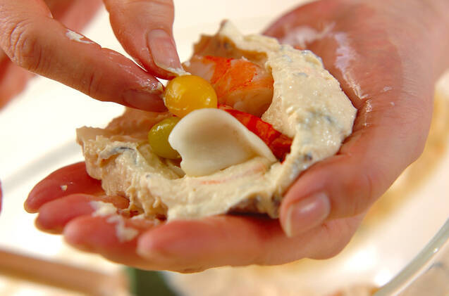 分量外のサラダ油を手に薄くぬり、(16)の生地を平たく広げ、エビ、ギンナン、ユリネを中央に入れ丸くまとめる。