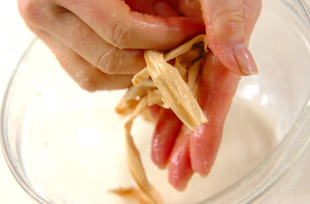 <餅巾着>を作る。カンピョウは水で洗って塩でもみ、水洗いして鍋にかぶるくらいの水と共に入れ、強火にかける。煮たったら弱火にして4~5分ゆで、ザルに上げて粗熱が取れたら水気を絞る。