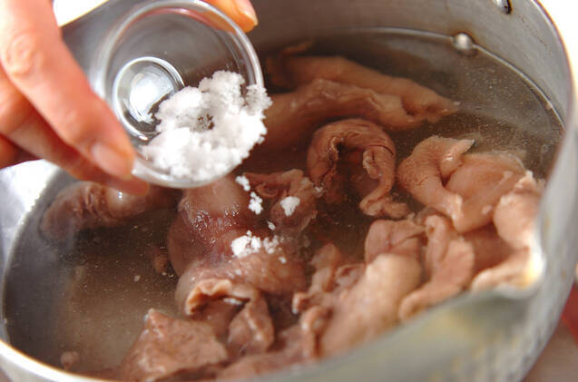 再びきれいな水をかぶるくらいまで入れ、<牛すじ肉をゆでる調味料>の材料を加え、強火にかける。