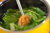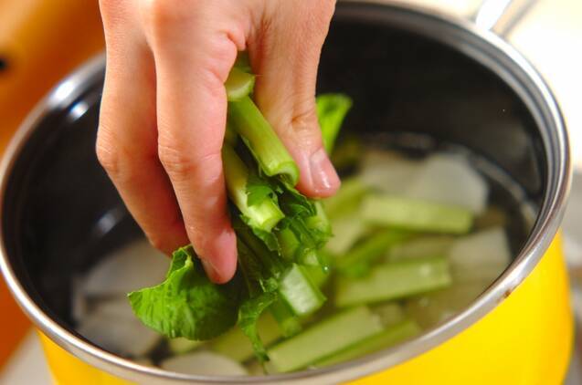 鍋にだし汁と大根を入れて火にかけ、大根が柔らかくなってきたら小松菜を加える。