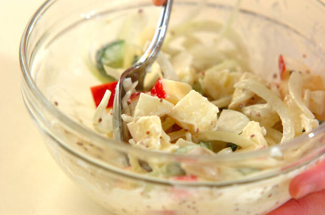 大きめのボウルに<ドレッシング>の材料を混ぜ合わせ、ジャガイモ、水気をしっかりきったリンゴ、キュウリ、玉ネギを混ぜ合わせる。器に盛り分け、お好みで粗びき黒コショウを振る。