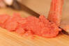 明太子は薄皮に切り込みを入れて中身をしごきだす。大葉は軸を切り落とし、縦半分に切ってせん切りにし、水に放って水気を絞る。