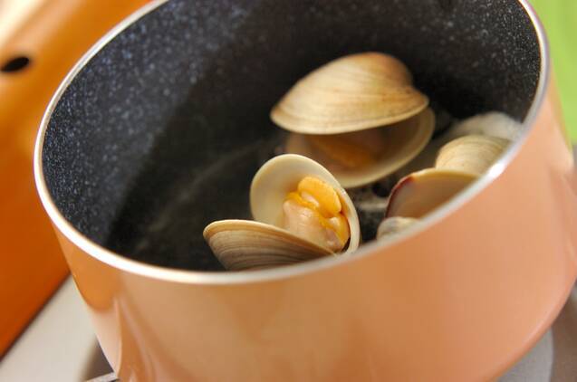 鍋にホンビノス貝を入れ、酒と水を加えてフタをし、中火にかける。沸騰したら鍋をゆすり、貝がすべて開いたら火を止める。