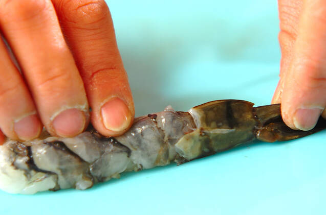 エビは第一関節から殻をむき、背ワタを取る。腹側に3~4ヶ所斜めに切り込みを入れ、背側から手のひらで押さえてまっすぐに伸ばし、白ワインをかける。
