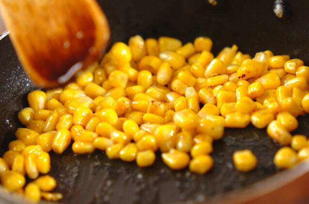<コーン炒め>を作る。フライパンでバター5gを熱し、水煮コーンを少し焼き色が付くまでしっかり炒め、塩コショウで味を調えて取り出す。