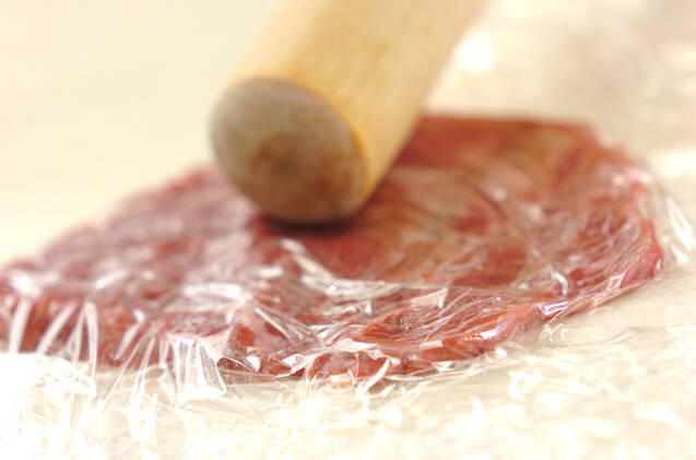 牛もも肉をラップにはさみ、すりこぎまたはビン等で5mm位の厚さになるまで叩いてのばし、塩コショウをする。(ヒント)できるだけ均一の厚さにのばすのが上手に揚げるポイントです。