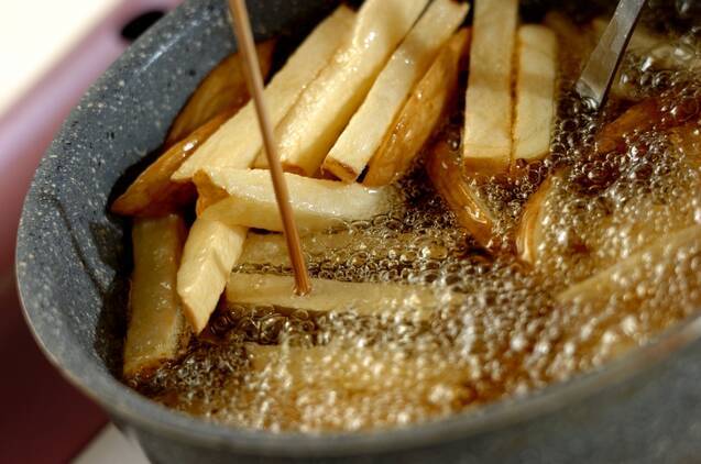 フライパンにジャガイモ、ヒタヒタの量のサラダ油を入れて中火にかける。薄いキツネ色になり、竹串がスッと刺さるようになったら取り出し、油をきる。