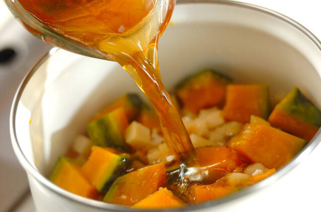水煮タケノコは、水煮大豆くらいの大きさに切る。鍋に(1)のカボチャと水煮大豆、水煮タケノコ、<合わせだし>の材料を入れて強火にかける。