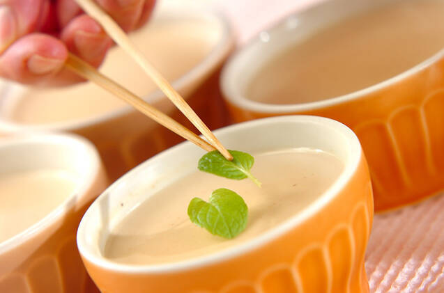 水でぬらした容器に(2)を流し入れ、冷蔵庫で冷やし固める。固まったらミントの葉を飾る。(ヒント)調理時間に冷やし固める時間は含まれていません。