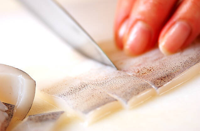 イカは胴と足がくっついている所を指で引っ張ってはがし、足を持って胴から引き抜く。胴は水洗いして軟骨を抜き取り、エンペラをはずして、1枚に開いて食べやすい大きさの短冊に切る。