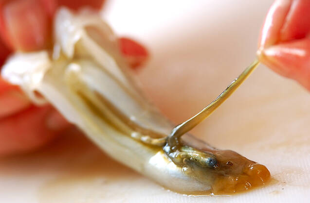 イカの足は目の際で切り落としてくちばしを取り、足先を切り揃える。吸盤は包丁でこそげ落し、2本ずつに切り分ける。ワタはスミ袋を取り除きワタ部分だけを取り、きれいに水洗いして包丁で刻んでおく。