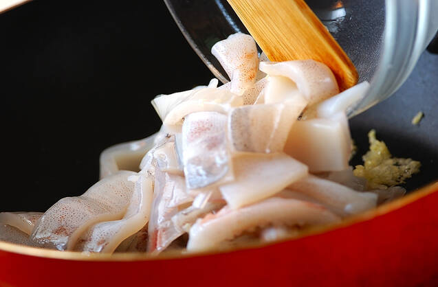 深めのフライパンにサラダ油、みじん切りショウガ、みじん切りニンニクを入れて中火にかけ、香りが立ってきたらイカを加え、色が変わるまで炒める。