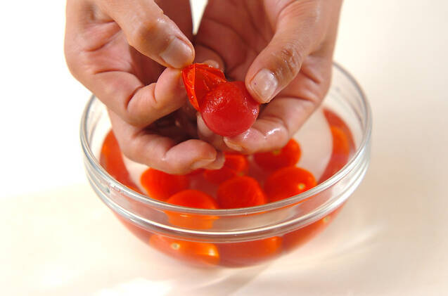 熱湯にヘタを取ったプチトマトを入れ、皮が破れたら取り出して冷水に取り、皮をむく。