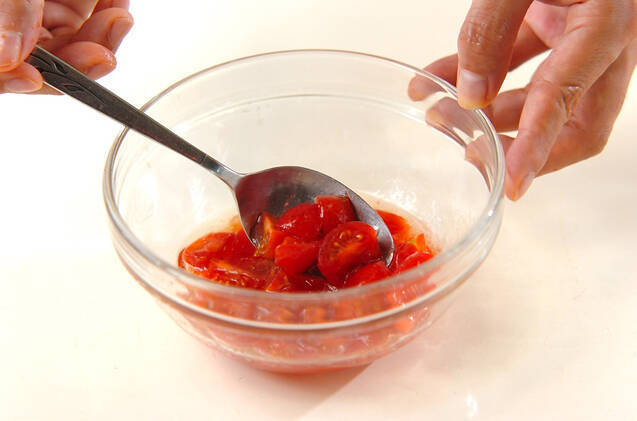 ボウルに<ジンジャーマリネ液>の材料を混ぜ合わせ、(1)のプチトマトを4等分に切って和える。食べる直前まで冷蔵庫に冷やしておく。