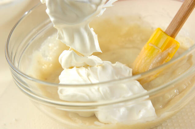 別のボウルに低脂肪生クリームを入れて7分立てにし、一部を(2)に加えてなじませ、残りも加えて混ぜ合わせる。器に流し、冷蔵庫で冷やしておく。