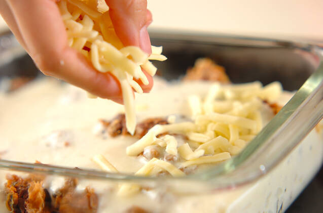 耐熱容器にご飯を入れ、軽く汁気をきったサバを入れる。その上から<ホワイト酒粕ソース>をかけてピザ用チーズを散らし、250℃に予熱しておいたオーブンで10~12分焼く。