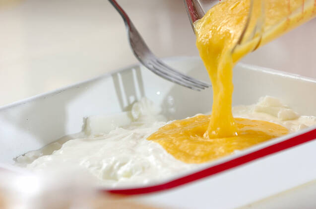 (1)に生クリーム、プレーンヨーグルト、マンゴーを加えてよく混ぜ合わせ、ラップをして30分以上冷凍庫で固める。