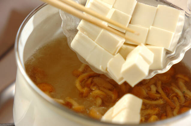 鍋にだし汁を入れて強火にかけ、煮たったらナメコ、豆腐を加え、再び煮たったらみそを溶き入れる。