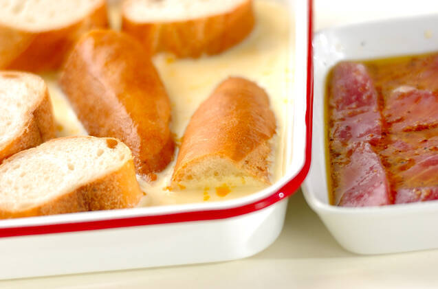 フレンチトーストの卵を割り、ハチミツ、牛乳、生クリームを混ぜ合わせバケットをからめて、冷蔵庫に入れておく。