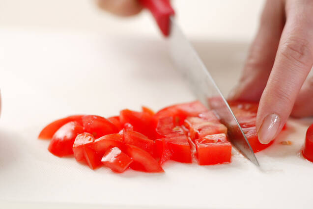 豆腐はサッと水洗いする。トマトはヘタをくり抜いて、ひとくち大に切る。
