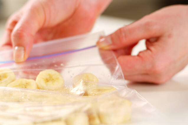 バナナは皮をむき、1cm幅に切る。ホワイトキュラソーをからめ、冷凍保存袋に入れ、凍らせる。